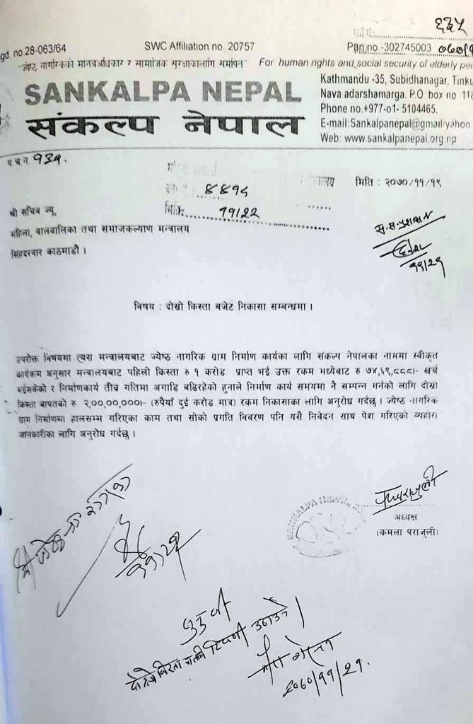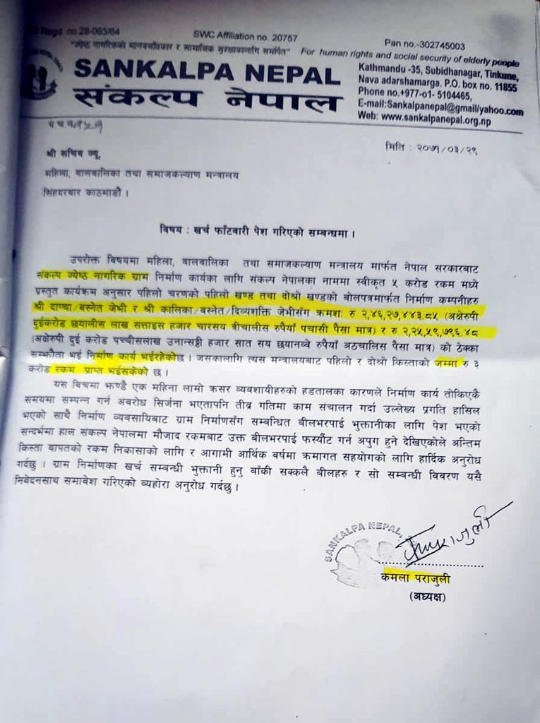 शंखरापुरमा निर्माण गर्न थालिएको जेष्ठ नागरिक ग्राममा अध्यक्ष पराजुलीले ७ करोड रकम बुझि हालसम्म अलपत्र अवस्थामा रहेको छ । नत निर्माण नै भयो, न त सरकारी बजेट नै रहयो । अध्यक्ष पराजुलीले कामको नाममा झ्वाम पार्नुभयो । अदालतमा मात्र हैन, उहाँको विरुद्धमा अख्तियार दुरुपयोग अनुसन्धान तथा महिला मन्त्रालयमा समेत उजुरी परेको छ । मन्त्रालयले उजुरी छानविन गर्ने समिति बनाएता पनि हालसम्म समितीले बुझाएको प्रतिवेदन सार्वजनिक गरिएको छ । प्रतिवेदन सार्वजनिक नगर्नु पनि अर्को गंभिर प्रश्न बनेको छ ।