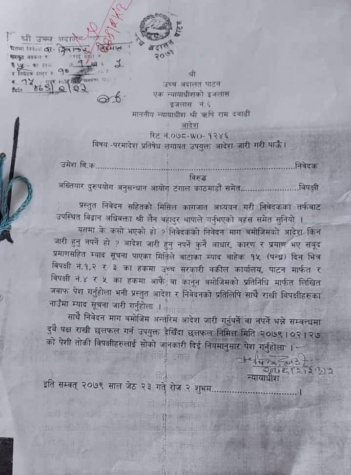 यसै क्रममा आधा आकाश ढाक्ने नेपाली महिलाहरुको नेतृत्व गरिरहेको राष्ट्रिय महिला आयोगको अध्यक्ष कमला पराजुलीमा पनि नैतिकताको प्रश्न खडा भएको छ । अध्यक्ष पराजुलीको विरुद्धमा उच्च अदालत पाटनले काठमाडौँको शंखरापुरमा निर्माण सुरु गरी अलपत्र परेको ‘संकल्प ज्येष्ठ नागरिक ग्राम’मा भएको अनियमितताबारे परेको रिटमा ‘कारण देखाऊ’ आदेश जारी गरेको छ । न्यायाधीश ऋषिराम दवाडीको एकल इजलासले सोमबार ‘कारण देखाऊ’ आदेश जारी गरेको हो । फैसलामा भनिएको छ, ‘निवेदकको निवेदन माग बमोजिम आदेश किन जारी हुनु नपर्ने ? आदेश जारी हुनु नपर्ने कुनै आधार, कारण र प्रमाण भए सबुद प्रमाणसहित लिखित जवाफ पेस गर्न’ ।
