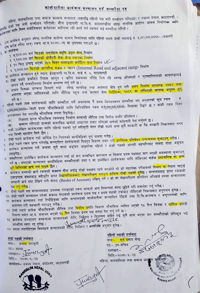 आयोगको अध्यक्ष पराजुली नै तत्तकालिन समयमा अध्यक्ष रहनुभएको संकल्प नेपालले निर्माण गरेको संकल्प जेष्ठ नागरिक ग्रामको कामलाई अदालतले कारण देखाउ आदेश जारी गरेपछि आफुले संवैधानिक आयोगबाट विदा लिएर, कार्यवहाक ताकेर वा राजिनामा दिएर आदलतलाई छानविनको लागि बाटो खुल्ला गर्नुपर्छ की पर्दैन ? आम महिलाको लागि मात्र नभई नेपाली जनताको नै प्रश्न बनेको छ ।