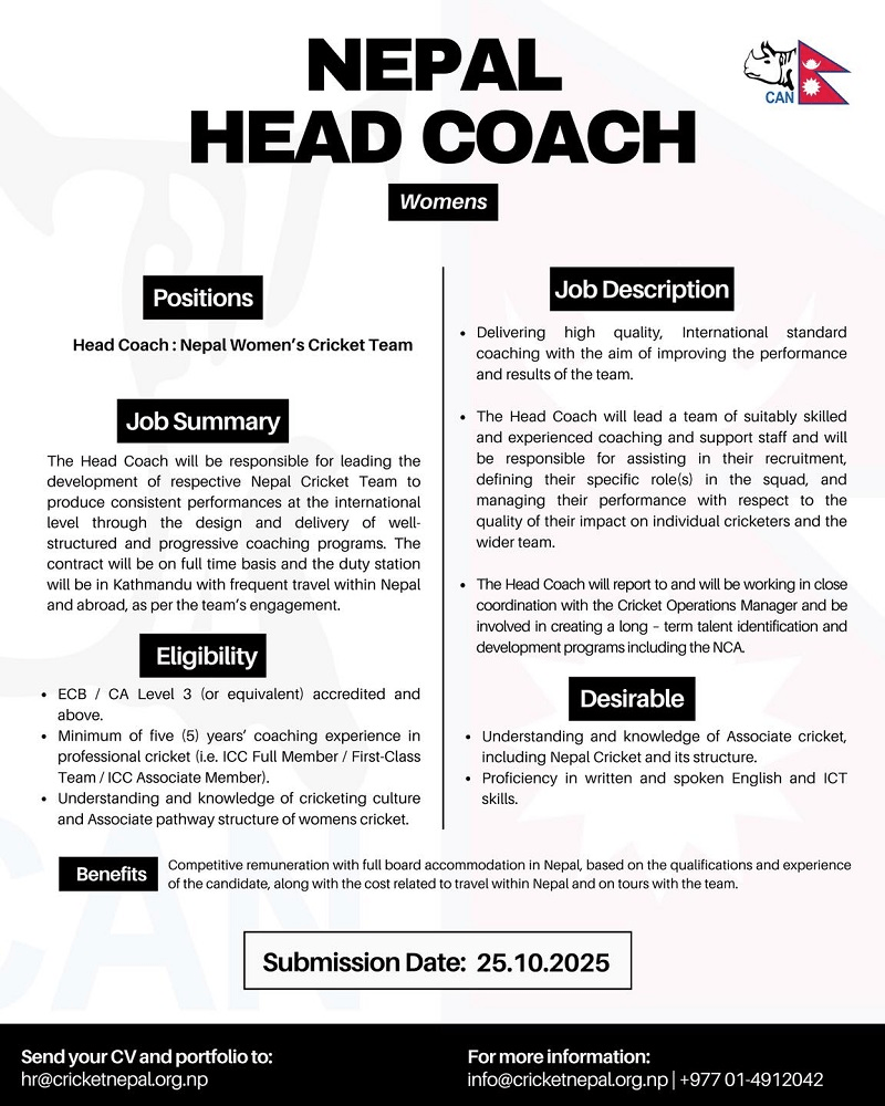 काठमाडौँ, २५ असाेज । नेपाल क्रिकेट सङ्घ (क्यान) ले नेपाली महिला राष्ट्रिय क्रिकेट टोलीको मुख्य प्रशिक्षकका लागि आवेदन खुलाएको छ ।