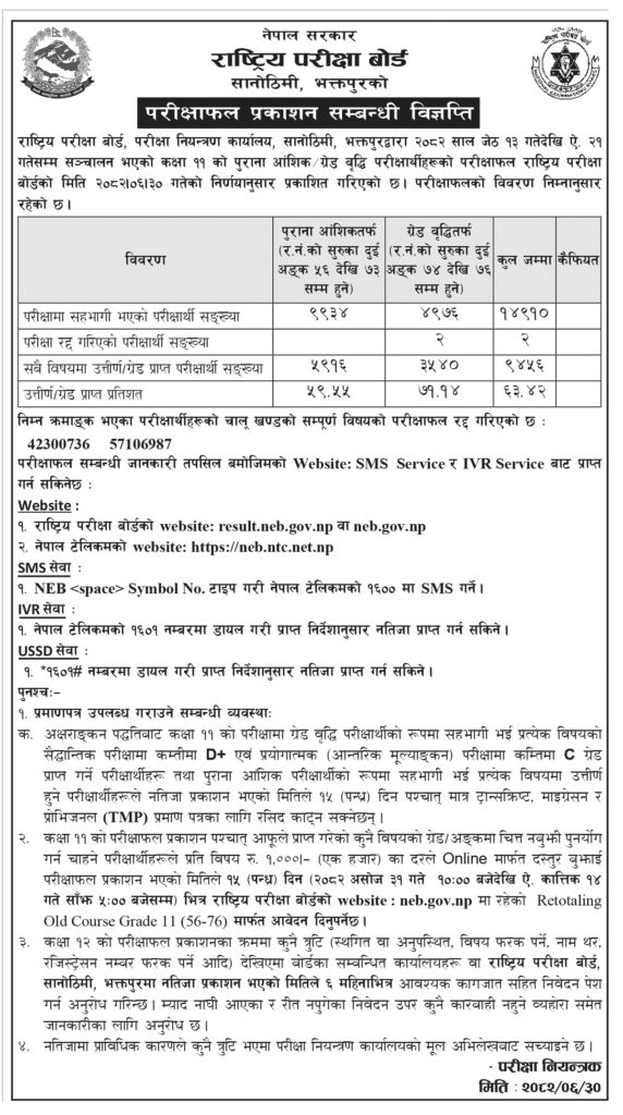 काठमाडौँ, ३१ असोज । राष्ट्रिय परीक्षा बोर्डले कक्षा ११ को आंशिक र ग्रेड वृद्धि परीक्षाको नतिजा सार्वजनिक गरेको छ ।