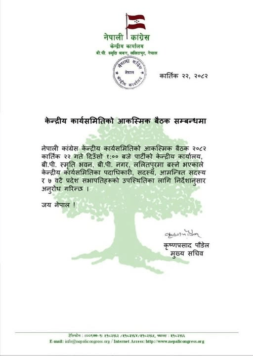 काठमाडौँ, २२ कार्तिक । नेपाली कांग्रेस केन्द्रीय कार्यसमितिको आकस्मिक बैठक बोलाइएको छ ।