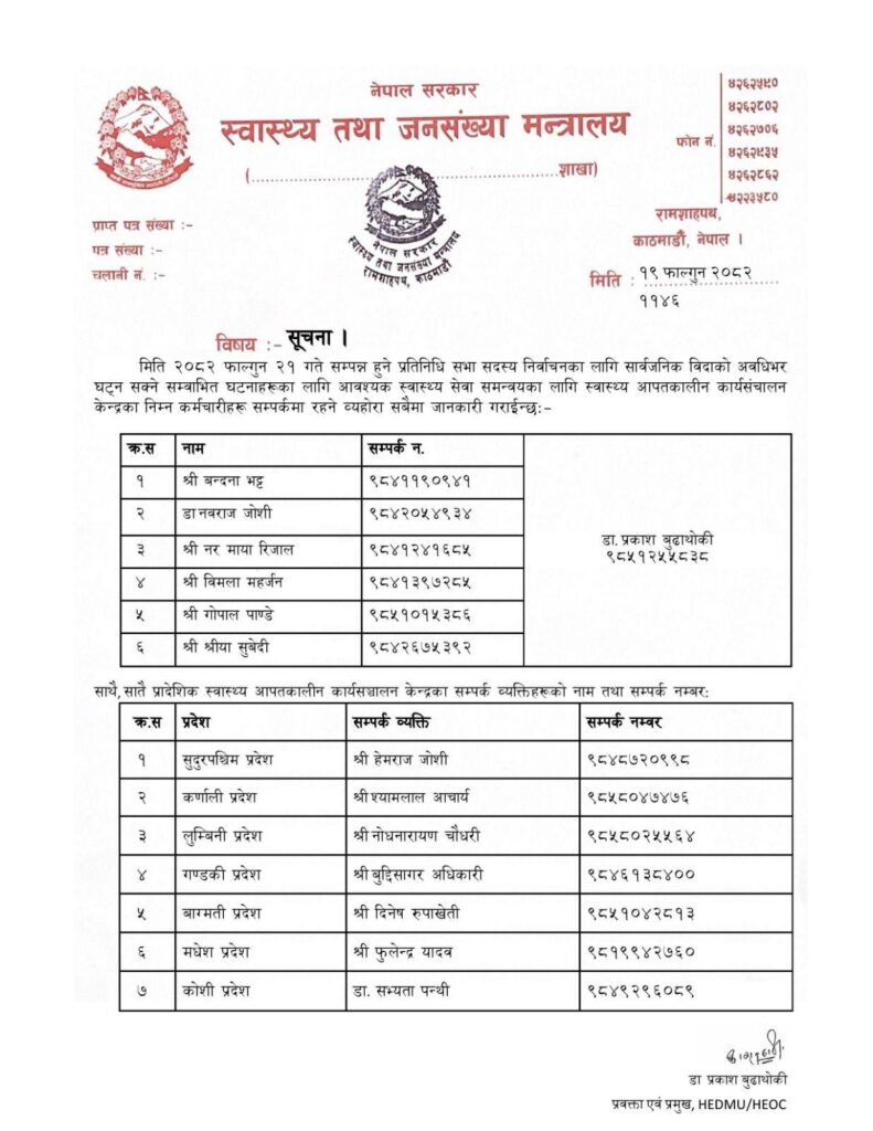 काठमाडौँ, २० फागुन । स्वास्थ्य तथा जनसङ्ख्या मन्त्रालयले आगामी फागुन २१ गते हुने प्रतिनिधि सभा सदस्य निर्वाचनका सन्दर्भमा स्वास्थ्य सेवा व्यवस्थापनका लागि सम्पर्क व्यक्तिहरू तोकेको छ।