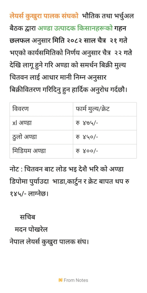 काठमाडौँ, २२ चैत । नेपाल लेयर्स कुखुरा पालक संघले अण्डाको बिक्री मूल्य फेरि बढाएको छ ।