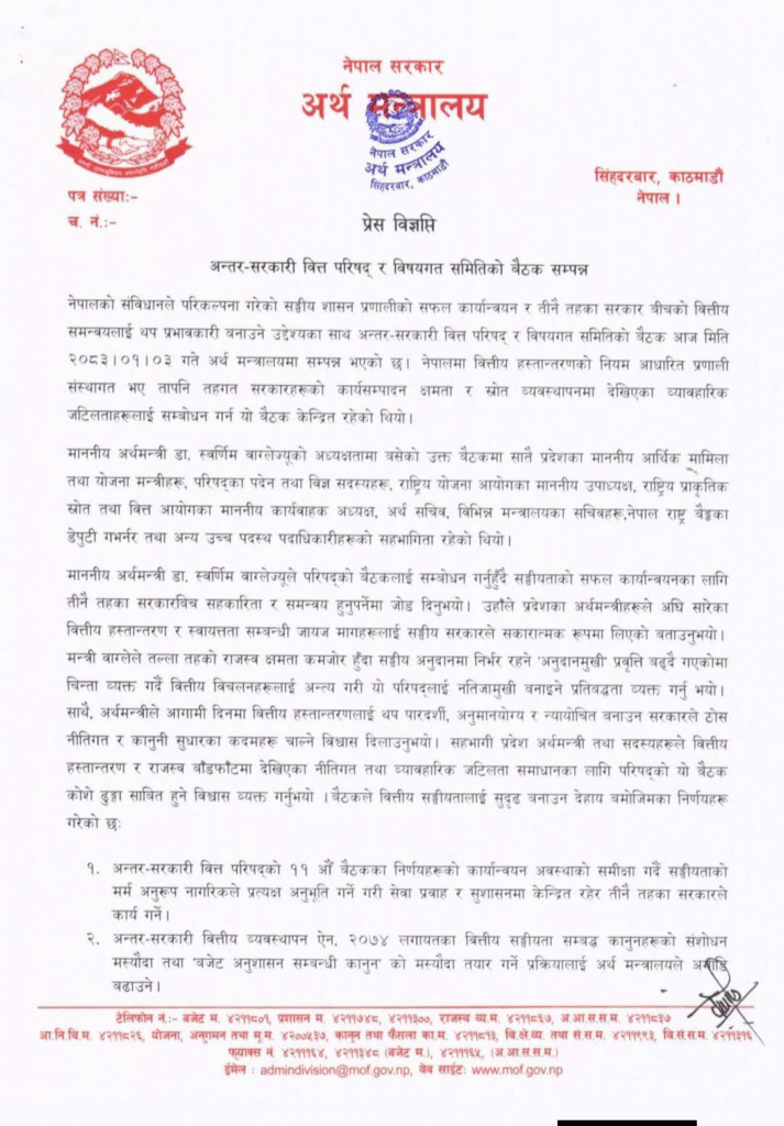 काठमाडौँ, ४ बैशाख । अर्थ मन्त्रालयमा बिहीबार अर्थमन्त्री स्वर्णिम वाग्लेको अध्यक्षतामा बसेको अन्तर सरकारी वित्त परिषद्को बैठकले दोहोरो कर हटाउने निर्णय गरेको छ ।