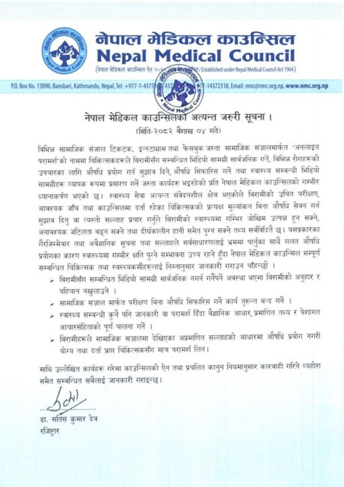 काउन्सिलले ‘अत्यन्त जरुरी सूचना’ जारी गर्दै बिरामीको प्रत्यक्ष परीक्षण नगरी औषधि सुझाउने तथा बिरामीको गोपनीयता भंग गर्ने कार्य तत्काल रोक्न निर्देशन दिएको हो ।