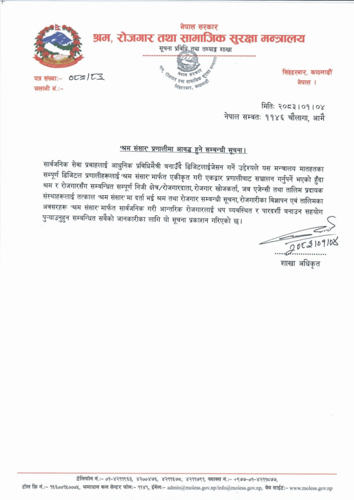 यसै सन्दर्भमा मन्त्रालयको सूचना प्रविधि तथा तथ्याङ्क शाखाले एक सूचना जारी गर्दै श्रम र रोजगारको क्षेत्रमा क्रियाशील सबै सरोकारवालाहरूलाई तत्काल यस प्रणालीमा आबद्ध हुन आह्वान गरेको छ। मन्त्रालयले निजी क्षेत्रका रोजगारदाता, रोजगार खोजिरहेका व्यक्तिहरू, जब एजेन्सीहरू तथा विभिन्न तालिम प्रदायक संस्थाहरूलाई अनिवार्य रूपमा ‘श्रम संसार’ मा दर्ता हुन निर्देशन दिएको हो ।