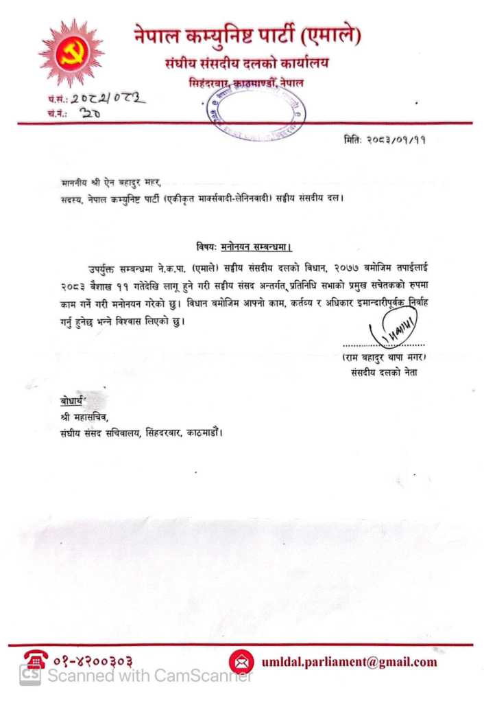 काठमाडौँ, ११ बैशाख । नेकपा (एमाले)ले प्रतिनिधि सभाको प्रमुख सचेतकमा ऐन बहादुर महरलाई मनोनयन गरेको छ।