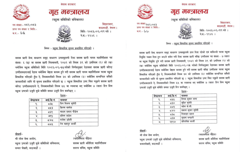 काठमाडौँ, १२ बैशाख । सशस्त्र प्रहरीमा प्रहरी नायव महानिरीक्षक र प्रहरी वरिष्ठ उपरीक्षक पदमा बढुवाका लागि सिफारिस गरिएको छ । बढुवा