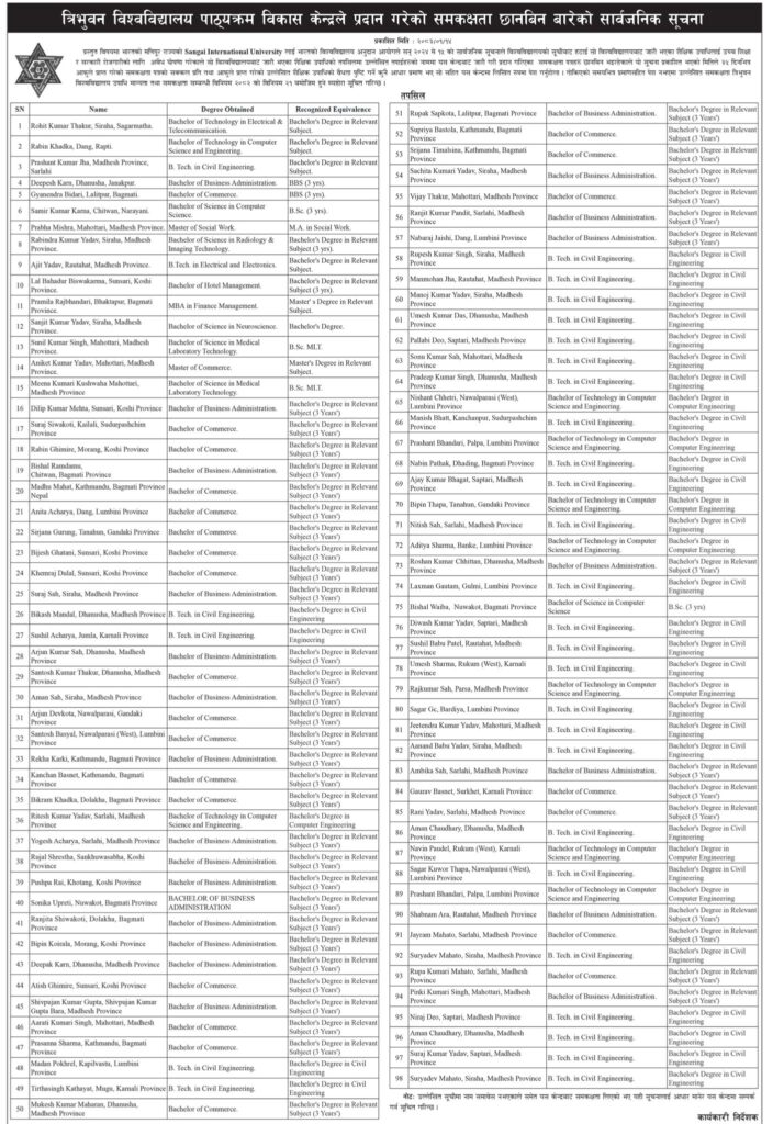 त्यसमा छानबिन गरिरहेको त्रिभुवन विश्वविद्यालयको पाठ्यक्रम विकास केन्द्रले ९८ जनाको नाम सार्वजनिक गर्दै शैक्षिक उपाधिको वैधता पुष्टि हुने कागजात पेस गर्न ३५ दिने अल्टिमेटम दिएको छ । भारतको विश्वविद्यालय अनुदान आयोगले सन् २०२४ को मे १५ मा मणिपुर राज्यको साङ्गाई इन्टरनेसनल युनिभर्सिटीलाई सूचीबाट हटाएको थियो । साथै सो युनिभर्सिटीबाट जारी भएका शैक्षिक उपाधिलाई उच्च शिक्षा र सरकारी रोजगारीका लागि अवैध घोषणा गरेको थियो ।
