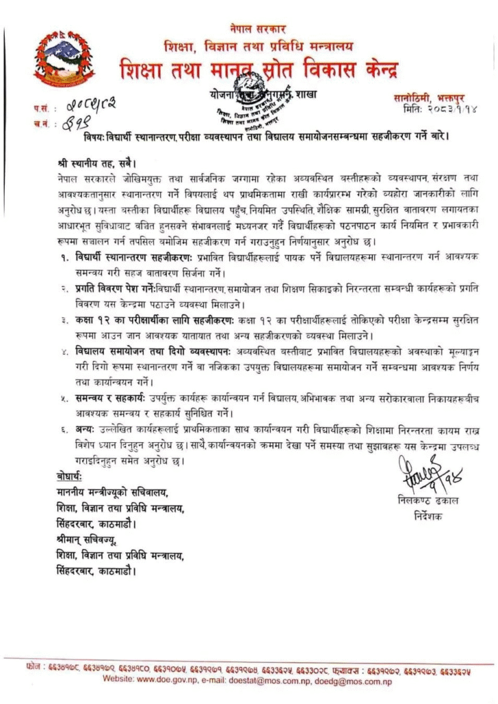 मन्त्रीको निर्देशन पछि मन्त्रालय अन्तर्गतको शिक्षा तथा मानव स्रोत विकास केन्द्रले अव्यवस्थित बस्ती स्थानान्तरण हुँदा त्यहाँ विद्यार्थीको परीक्षा व्यवस्थापन, प्रभावित वस्तिमै रहेका विद्यालय समायोजन तथा समन्वयलाई प्रभावकारी बनाउन विभिन्न निर्देशन तथा अनुरोध जारी गरेको हो ।