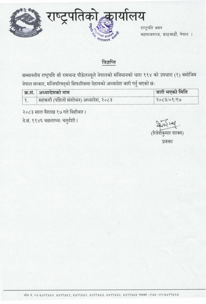 काठमाडौँ, १७ बैशाख । राष्ट्रपति रामचन्द्र पौडेलले ‘सहकारी (पहिलो संशोधन) अध्यादेश, २०८३’ जारी गरेका छन् ।